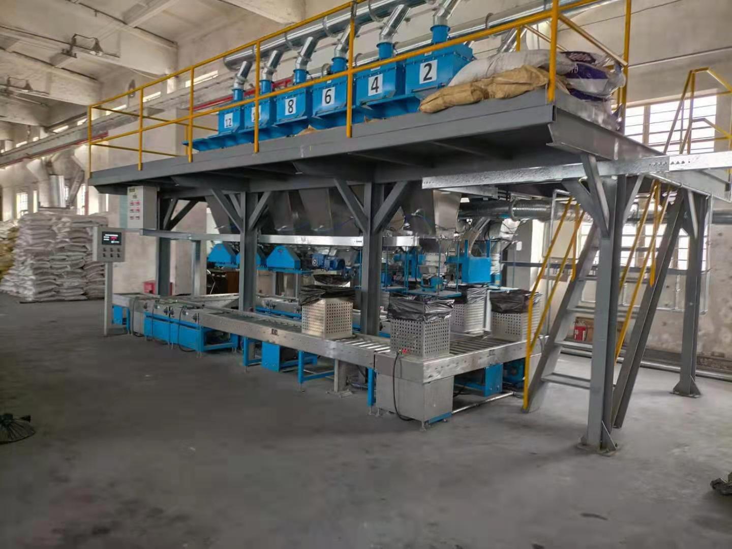 此系統(tǒng)由解包斗、儲(chǔ)斗、加料裝置、電子配料秤、校核用電子秤、操作輥道、運(yùn)輸輥道、除塵系統(tǒng)及控制系統(tǒng)組成。操作人員將塑料袋套在配料筐上(也可以由機(jī)械手自動(dòng)套、取袋),配料筐在定位運(yùn)輸輥道、升降轉(zhuǎn)向輥道、電子配料秤、校核秤上自動(dòng)運(yùn)行;配料時(shí),各配料筐按工藝配方要求,自動(dòng)運(yùn)行到相應(yīng)電子配料秤上定位,自動(dòng)扣除皮重,由加料裝置按照預(yù)先設(shè)置的配方自動(dòng)向配料筐內(nèi)加料;物料配好后,經(jīng)校核秤校驗(yàn),自動(dòng)運(yùn)行到定位輥道上等候取料。操作人員取出配好料的塑料袋(也可以由機(jī)械手自動(dòng)套、取袋),放上新塑料袋,系統(tǒng)將自動(dòng)準(zhǔn)備開(kāi)始新一輪循環(huán)工作。